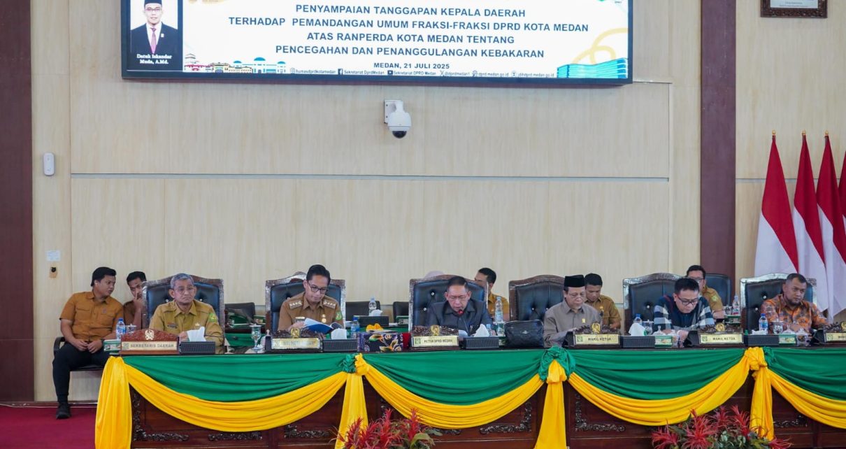 MEDAN – Wali Kota Medan, Rico Tri Putra Bayu Waas, menyampaikan tanggapan atas pemandangan umum fraksi-fraksi DPRD terkait Rancangan Peraturan Daerah (Ranperda) tentang Pencegahan dan Penanggulangan Kebakaran dalam Sidang Paripurna DPRD, Senin (21/7/2025). Bersama Sekda Wiriya Alrahman, ia menegaskan komitmen Pemko meningkatkan kesiapsiagaan dan perlindungan warga dari risiko kebakaran.